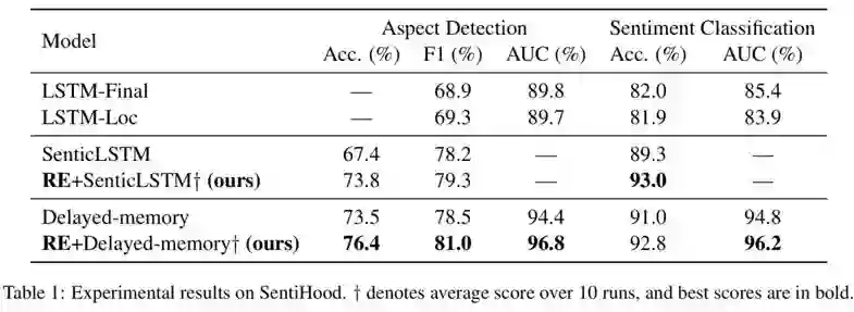 从表中结果可以看出,本文提出的优化目标和方面向量表示的方法在目标识别和情感分类任务中都取得了更好的表现,这说明了上下文相关的目标和方面表示能提升模型在细粒度情感分析任务中的效果。同时我们可以发现本文提出的目标-方面向量表示可以适用于大部分基于深度学习的目标-方面文本情感分类模型。