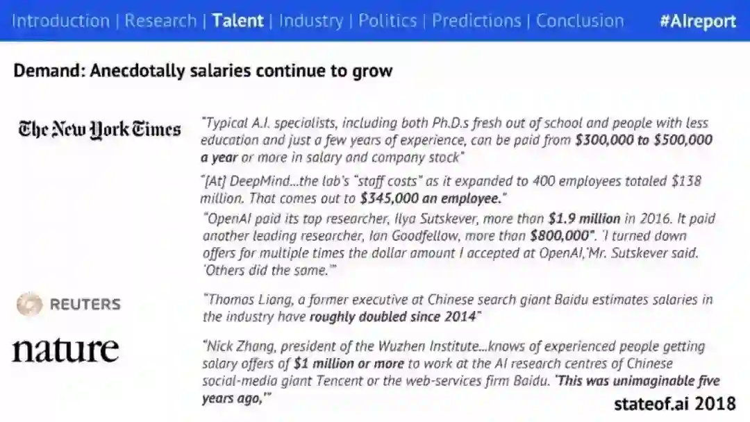 随着人工智能的兴起,AI 工程师成为当前最稀缺的人才,据《纽约时报》报道,人才的紧缺也导致 AI 工程师的薪资水涨船高,一般来说,刚出校门的博士生或有若干年工作经验但教育低于博士的 AI 专家年薪可以达到 30-50 万美元,或通过持有公司股票可能得到更高的薪水。