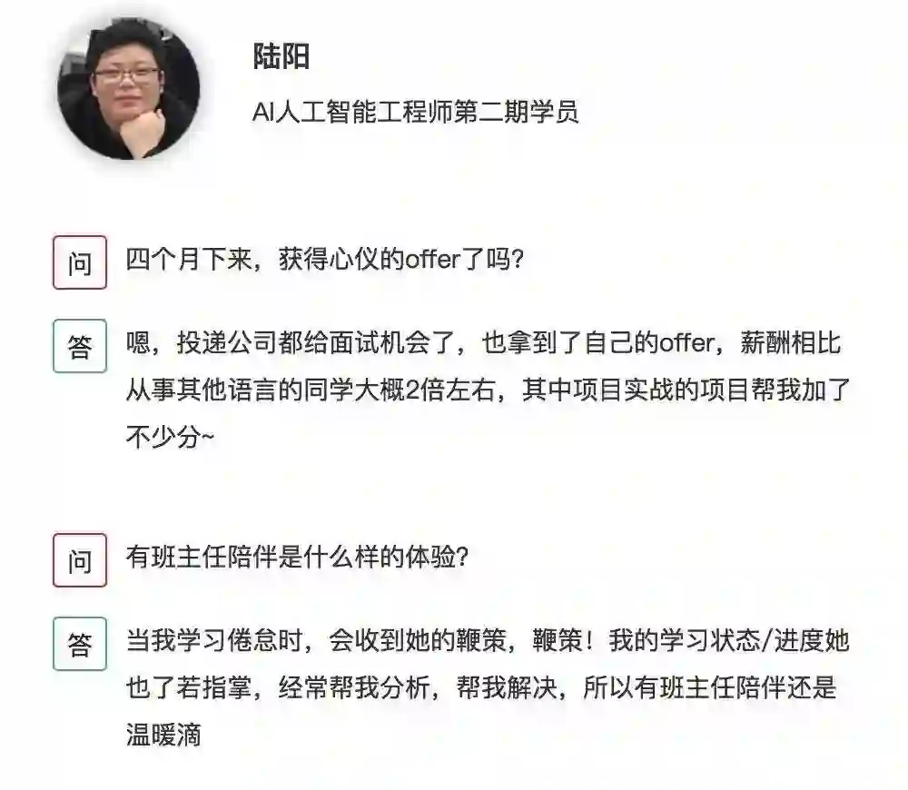 所以,与其盯着年龄的增长看着目标的职位无可奈何,不如为自己规划一个新的五年计划。如果你仍然没有思路的话,营长推荐自家学院精心为程序员重磅打造的《人工智能工程师》计划。