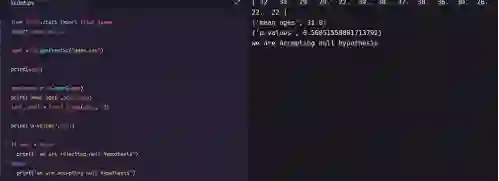 from scipy.stats import ttest_1sampimport numpy as npages = np.genfromtxt(“ages.csv”)print(ages)ages_mean = np.mean(ages)print(ages_mean)tset, pval = ttest_1samp(ages, 30)print(“p-values”,pval)if pval < 0.05: # alpha value is 0.05 or 5% print(" we are rejecting null hypothesis")else: print("we are accepting null hypothesis”)