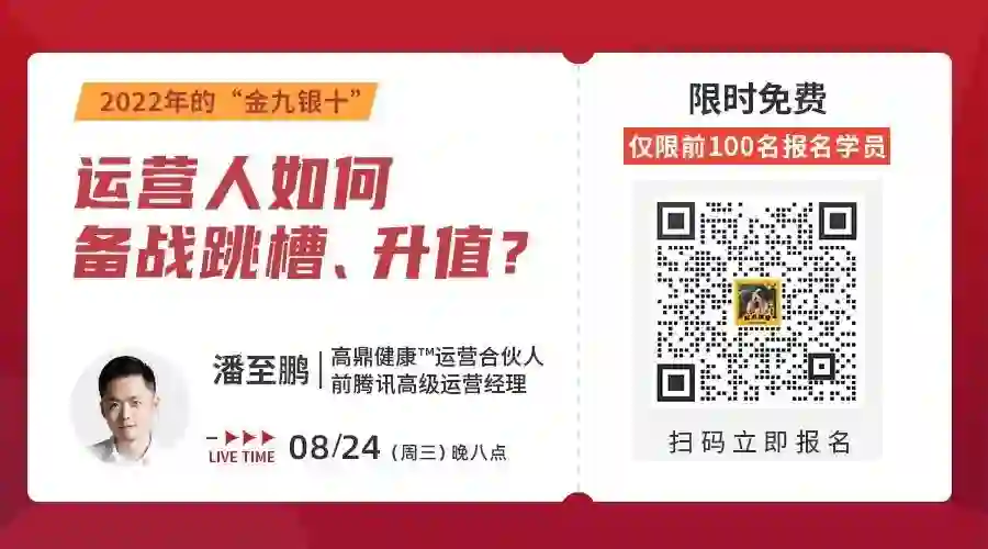 关于跳槽,你是否也有一肚子的问题,别担心,8月24日(下周三)晚,前腾讯高级运营经理@潘至鹏老师将会为你带来免费直播👇