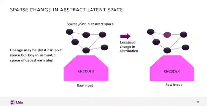 其实,在抽象空间中,更改是局部化的,可能只需要修改一个变量、一个条件或一个因素。因此,学习如何适应修改后的分布变得容易得多,如果以正确的方式表示信息,就可以快速传输。