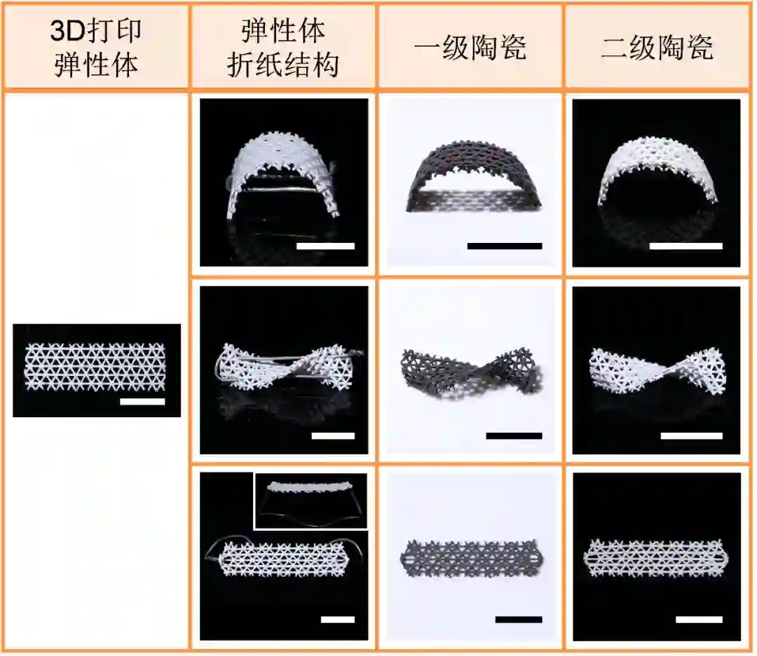 有鉴于此,吕坚教授研究组从材料出发,开发了不同系统的硅胶基质纳米复合弹性体材料作为陶瓷前驱体。这些弹性体材料的特性使其可以完成从3D打印到变形的过程,并且最终转变为陶瓷结构,从而逐步实现打印陶瓷折纸结构(Printed ceramic origami)和4D打印陶瓷 (4D printing of ceramics)。