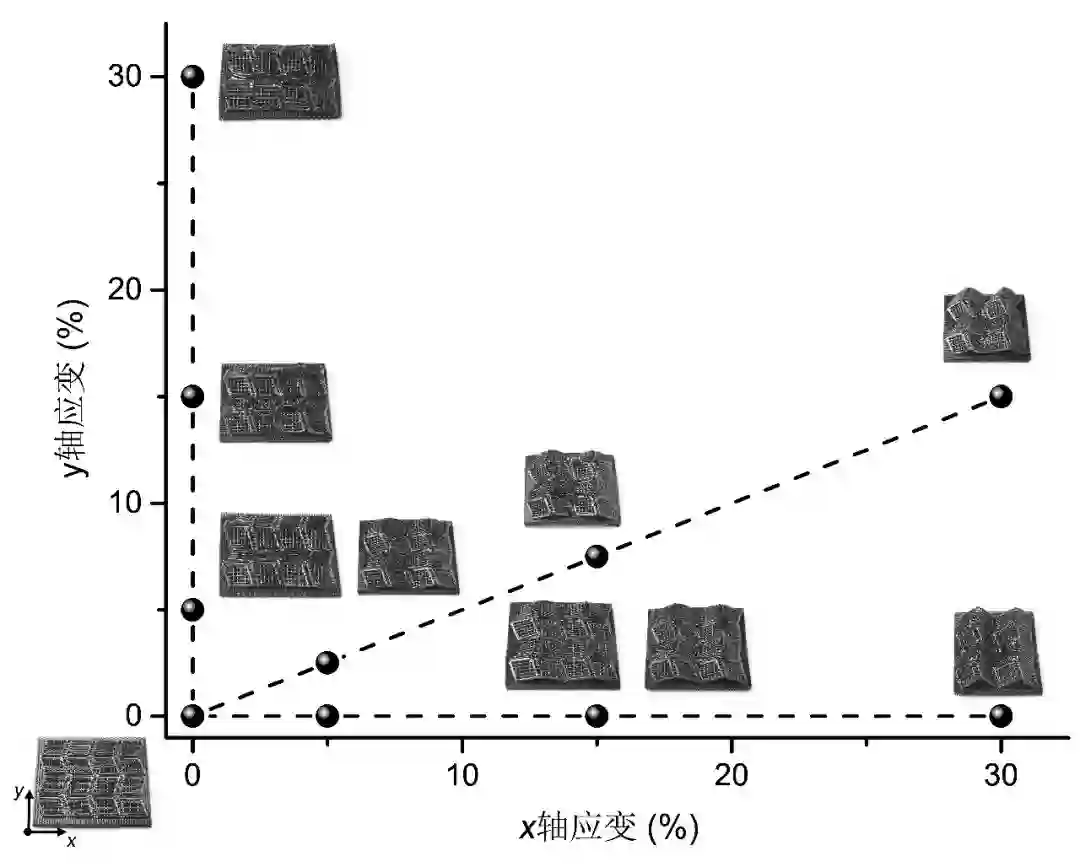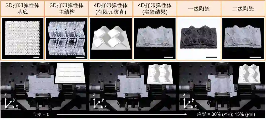 在方法一中,他们设计制造了可编程自动双轴拉伸装置,将3D打印的基底在两个方向进行预拉伸,拉伸的速度由电机编程控制。在拉伸状态下的基底上打印设计好的连接点,用于连接基底和其上的3D打印得到的主结构。等连接点固化后,在电机控制下释放基底中的预应力,主结构就会发生屈曲变形,与基底一起形成4D打印的弹性体结构,热处理后进而形成4D打印的陶瓷结构。