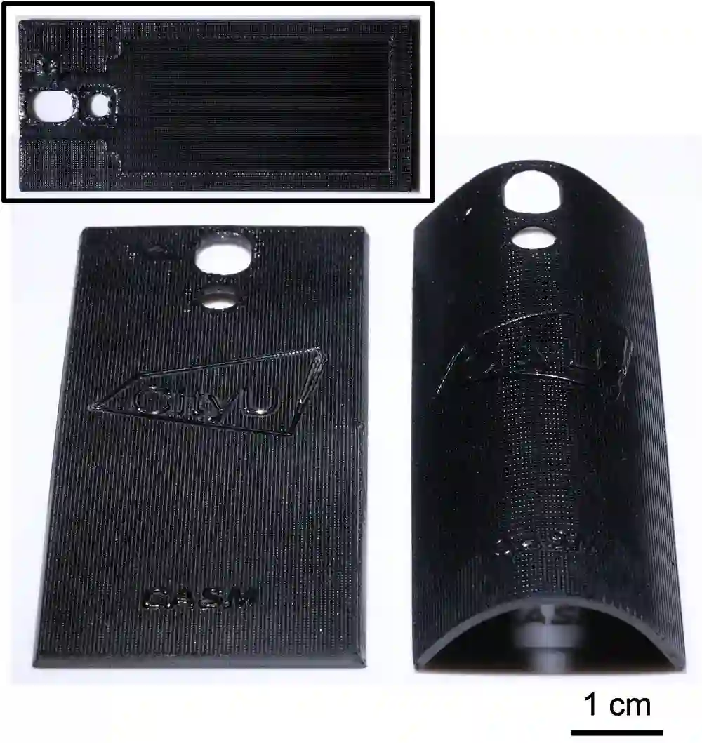 下图是他们打印的陶瓷手机背板,左边是平面板结构,右边是曲面板结构,小图里是平面板结构的另一个表面。相较于传统的陶瓷成型工艺(譬如注塑成型等),他们的技术较易实现个性化定制,尤其在制造类似曲面板这样的陶瓷结构上,而且可以实现超复杂精细结构,成本低强度高,有望应用在包括陶瓷手机背板和中框,陶瓷手表的表壳表圈表链等3C产业中。