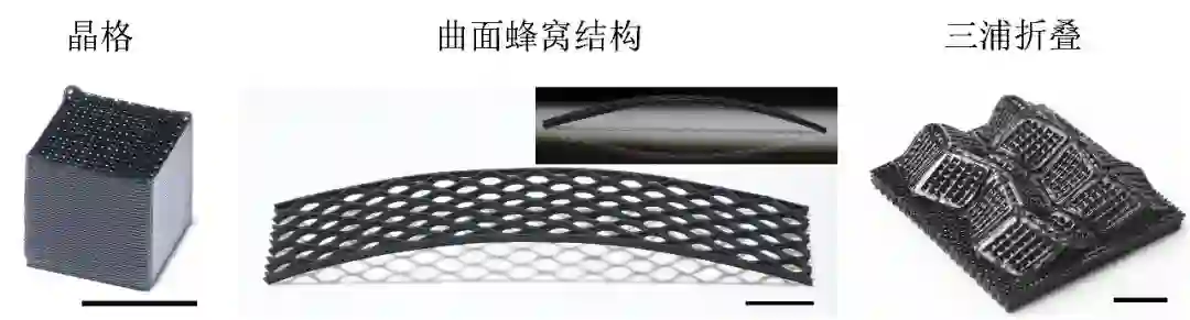 以经典的拓扑结构三浦折叠(Miura-ori)为例,在可编程自动双轴拉伸装置的辅助下,三浦折叠“生长”了出来,实验结果也与有限元仿真(finite-element analysis)相吻合。基于其周期性和对称性,三浦折叠也可以作为基本结构单元来构建更加复杂的结构。