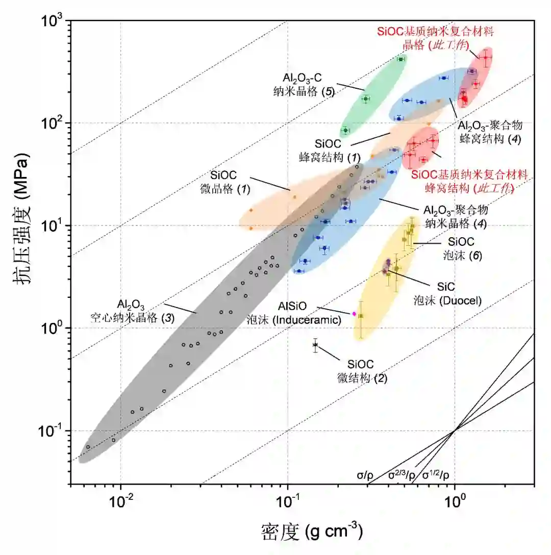 下图显示了抗压强度-密度的Ashby Chart,此次研究中的SiOC基质纳米复合材料的晶格和蜂窝结构(红色星号标记),与其他参考文献中报道的结果和市售的SiC、AlSiO泡沫的性能作了比较。此次研究中的打印陶瓷晶格结构的抗压强度可以达到547 MPa(密度约为1.6 g cm-3),其比强度约为传统SiOC泡沫的19倍。
