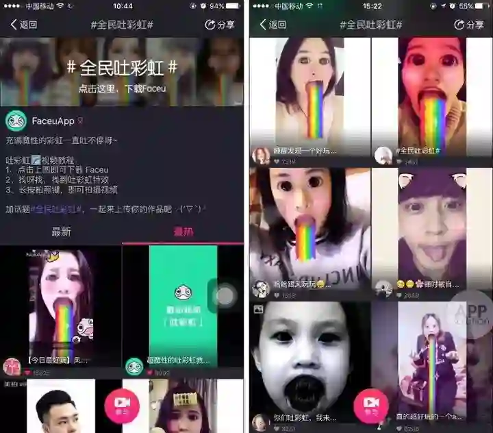 2016年1月,这款主打动态贴纸的美颜类相机发布了#全民吐彩虹#话题,并邀请《太子妃升职记》里的九王于朦胧助力,一举登顶应用榜,并在接下来的三周时间里持续霸榜。