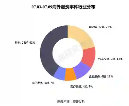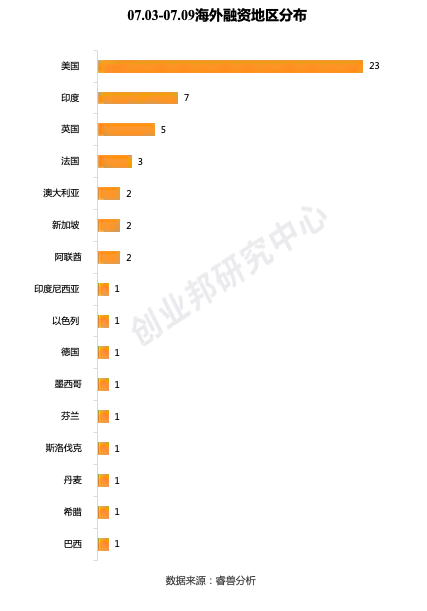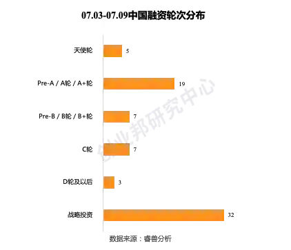 本周海外融资事件的融资轮次分布主要集中在前期(种子轮、天使轮、A轮)有25起;中后期(B轮、C轮、D轮及以后)有13起;战略投资本周有18起。