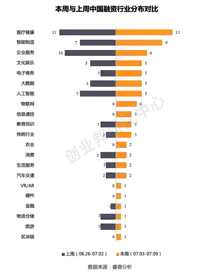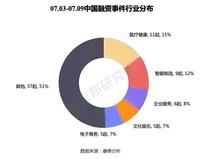相比于上周,医疗健康、智能制造热度不减;企业服务相比上周10起有所减少,本周有6起事件;物联网、信息通信事件数量相比上周有所增加。