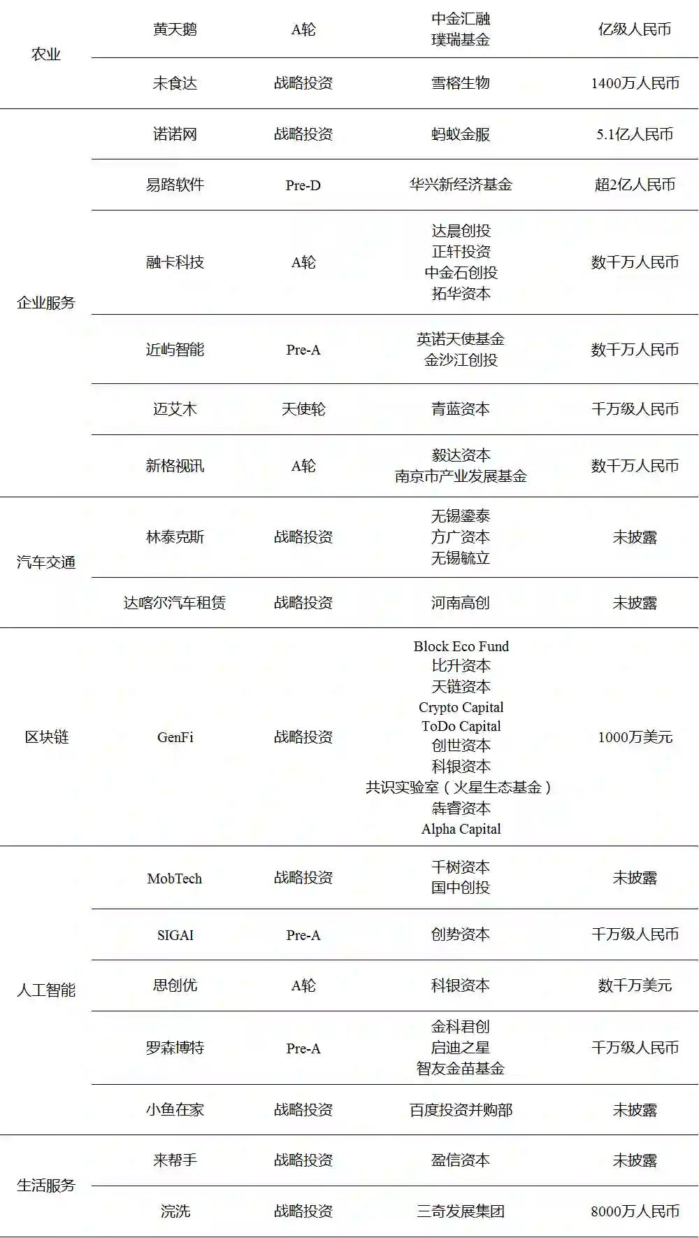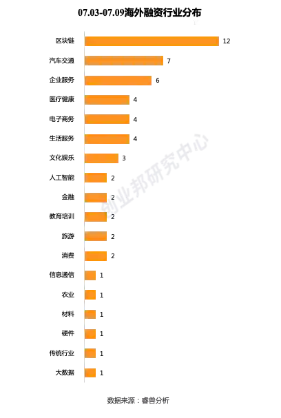 个行业领域,其中区块链12起,汽车交通7起,企业服务6起,医疗健康、电子商务、生活服务并列4起。