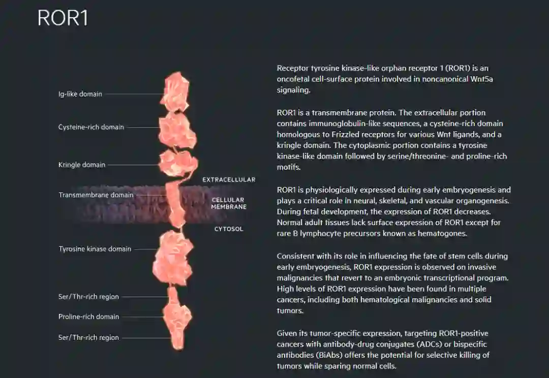 ROR1全称是受体酪氨酸激酶类孤儿受体1(receptor tyrosine kinase-like orphan receptor 1),是一类癌胎细胞表面蛋白(oncofetal cell-surface protein),参与了非经典的Wnt5a信号通路。