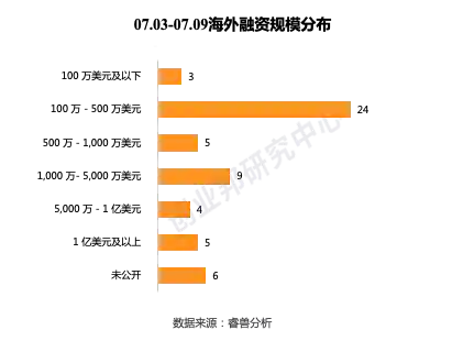 本周海外融资事件的融资规模主要集中在100万-500万美元,共24起。