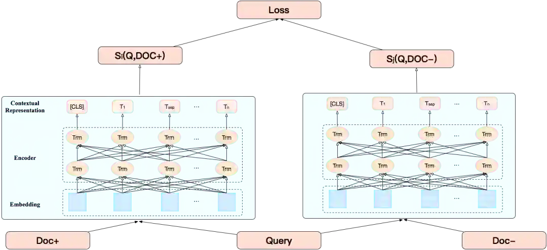 对于同一Query的候选Doc,选择两个不同标注的Doc,其中相关文档记为Doc+,不相关文档记Doc-。输入层通过Lookup Table 将Query, Doc+以及Doc-的单词转换为 Token 向量,同时会拼接位置向量和片段向量,形成最终输入向量。接着通过BERT模型可以分别得到(Query, Doc+)以及(Query, Doc-)的语义相关性表征,即BERT的CLS位输出。经过Softmax归一化后,可以分别得到(Query, Doc+)和(Query, Doc-)的语义相似度打分。