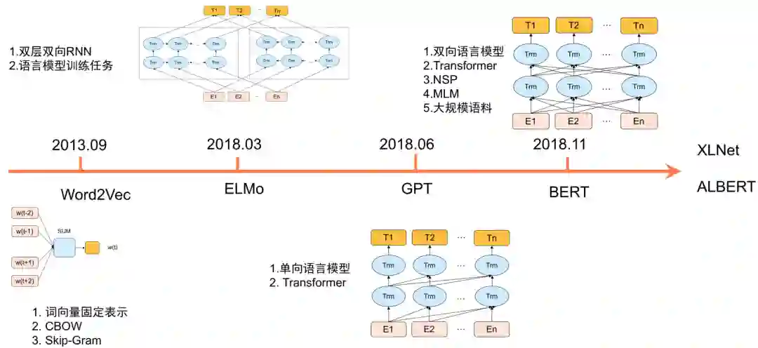相比RNN模型,Transformer语义特征提取能力更强,具备长距离特征捕获能力,且可以并行训练,在机器翻译等NLP任务上效果显著。Open AI团队的GPT[7]使用Transformer替换RNN进行深层单向语言模型预训练,并通过在下游任务上Fine-tuning验证了Pretrain-Finetune范式的有效性。在此基础上,Google BERT引入了MLM(Masked Language Model)及NSP(Next Sentence Prediction,NSP)两个预训练任务,并在更大规模语料上进行预训练,在11项自然语言理解任务上刷新了最好指标。BERT的成功启发了大量后续工作,总结如下: