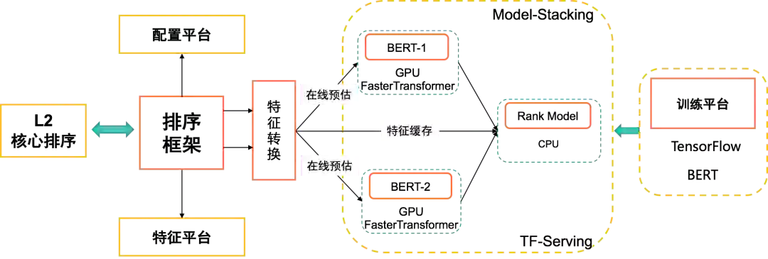 TF-Serving在线模型服务:L2排序模型、BERT模型上线使用TF-Serving进行部署。TF-Serving预测引擎支持Faster Transformer[38]加速BERT推理,提升了线上的预估速度。