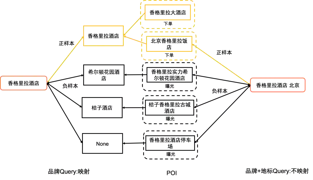 负样本过滤:如果搜索词是品牌词,在选取负样本的时候只在其他品牌的样本中选取。如POI为“香格里拉实力希尔顿花园酒店”、“桔子香格里拉古城酒店”时,同Query “香格里拉酒店”虽然字面很相似,但其明显不是用户想要的品牌。