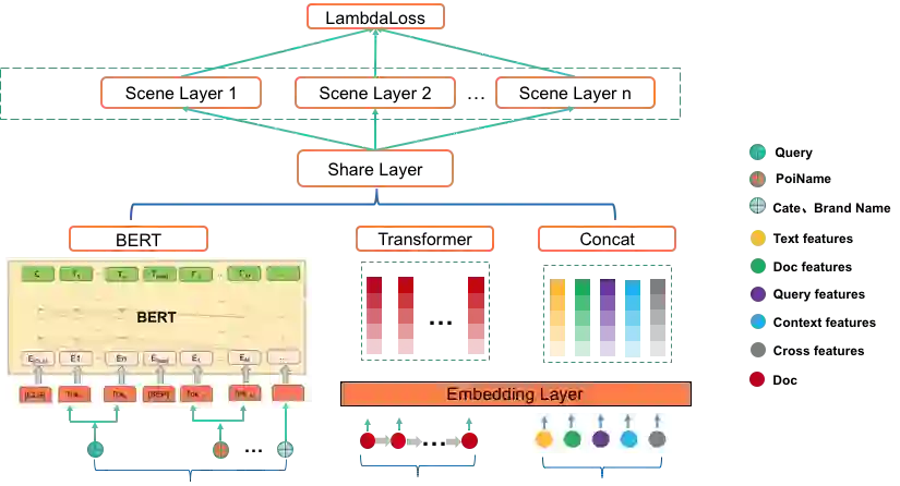 损失函数:搜索业务更关心排在页面头部结果的好坏,将更相关的结果排到头部,用户会获得更好的体验,因此选用优化NDCG的Lambda Loss[34]。
