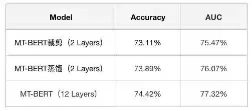 在工程架构上,针对BERT在线预估性能耗时长的问题,参考业界经验,我们采用了BERT模型轻量化的方案进行模型蒸馏裁剪,既保证模型效果又提升了性能,同时我们对整体排序架构进行了升级,为后续快速将BERT应用到线上预估奠定了良好基础。