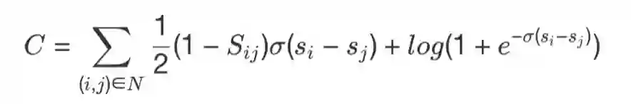 使用交叉熵损失函数,令表示样本对的真实标记,当比更相关时(即为正例而为负例),为1,否则为-1,损失函数可以表示为: