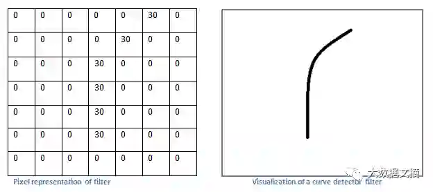 让我们从更高层次来看卷积实际在做什么吧。每一个过滤器都可以看做为一个特征标识器。这里的特征是指直线、简单的颜色以及曲线之类的东西,这些都是图片所共有的最简单特征。我们的第一个过滤器是一个7 x 7 x 3的曲线检测器。(为了简化这个问题,在这里我们先忽略过滤器有3个单位深度这一事实,只考虑过滤器和图片的最上层切片。)曲线检测器有一定的像素结构,在该结构中,沿着曲线形状的区域将具有更高的数值。