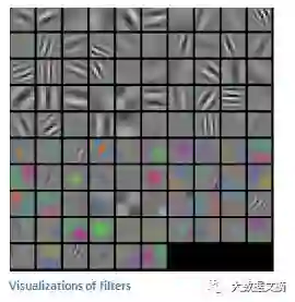免责声明:在本节中的所描述的简化版的过滤器,是为了说明一个卷积中所涉及到的数学问题。在下图中,你可以看到一个已经训练好的神经网络中,第一个卷积层中过滤器可视化的一些示例。但它们主要的想法还是一致的。第一个卷积层中的过滤器对于输入的图片进行卷积,当过滤器所代表的某个具体特征在输入中被发现时,过滤器就会被“激活”(或者得到很高的值)。