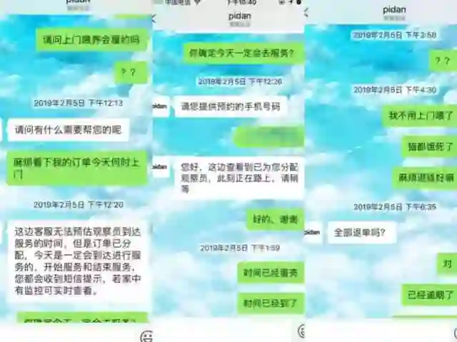 然而直至2月5日中午十二点,仍然没有Pidan的工作人员履约上门喂猫。等了又等,王璐通过微信询问Pidan客服,得到的回复是“订单已分配,今天一定会到达进行服务”,但一直到约定时间末端的下午2点,都无人上门服务。