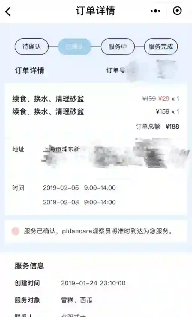 此时,远在数百公里以外的王璐也遭遇同样的问题。据她阐述,通过Pidan淘宝旗舰店上门喂猫的服务链接,王璐按照页面指引在其小程序上下了单,约定2月5日和2月8日上午9点至下午2点共两次的上门喂养服务,包括帮助猫咪续食、换水和清理猫砂盆三项服务,一次上门159元。