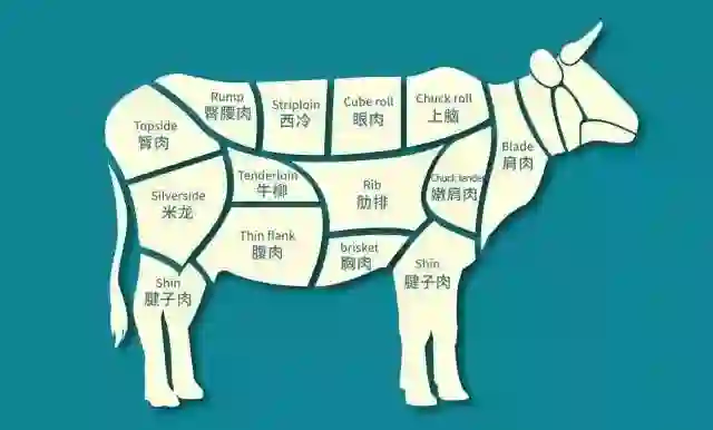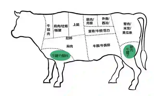 从牛的结构图中你可以看出西冷牛排、眼肉牛排和菲力牛排分别在牛的哪个位置。