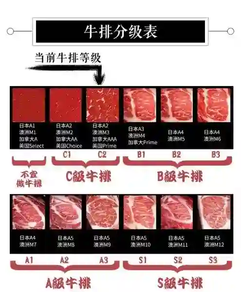 日本和牛A1-A5,澳洲牛肉M9,加拿大牛排AAA级,美国USDA的Premier。大家不要觉得等级越高,牛排就越好。各个国家的等级标准是不同的。