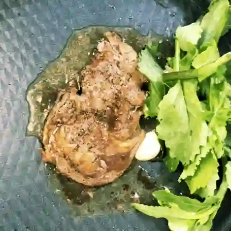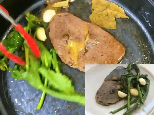 最后把牛排盛到一个被加热过的盘子,或者用盖子扣上,牛排需要静置2分钟,名为:醒肉。这2分钟是为了锁住牛排里面的汁水。