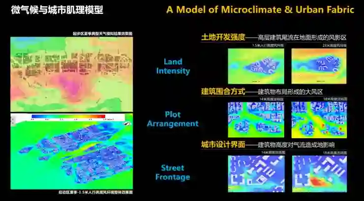 因此我们采用分级分类的,不同轻重缓急的调节方式进行优化,来解决预警所发现的问题。这里展示的是模型背后或者说是评估背后的模型,比如说微气侯和城市机理之间的关系。目前对于城市的健康、发展是非常关注,城市的宜居性不仅是大的气候条件影响,也包括建筑环境,我们的高度、密度对于微气候的影响,比如对于土地开发强度有什么影响,对于建筑的围合方式,乃至于街道建筑商材料颗粒度细腻度,都会有很多的影响,这都是考虑的方面。