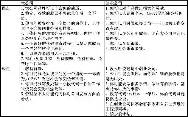 我在大学期间曾分别在一家大公司和一家初创公司实习过。我的印象与人们通常所说的大公司稳定、初创公司高强度(高风险)非常一致。在我那些选择不攻读博士学位的朋友中,约有 40% 的人去了大公司,40% 的人在创业公司工作,其余的人自己开了公司。他们都给了我有力的论据。当然,每个公司的优缺点各不相同,下面简单列了一些: