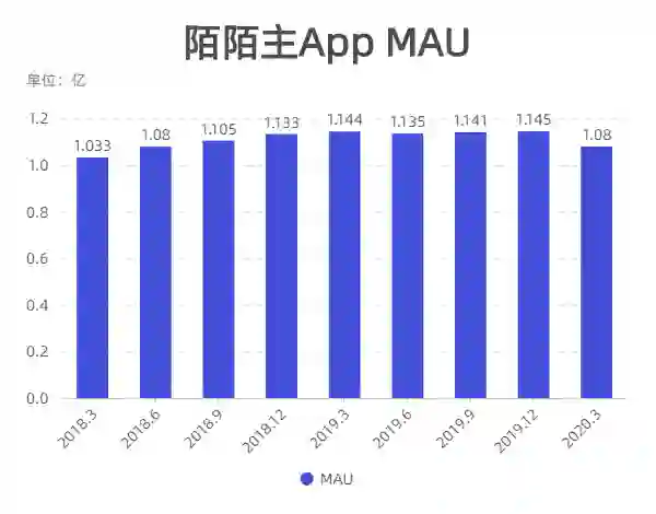 财报显示:2018年3月,陌陌月活跃用户数量(MAU)首次突破1亿。其后,陌陌的月活用户数均在1.1亿左右徘徊,2020年3月更是创下近18个月内新低,重回2018年6月。