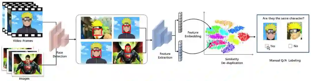 利用卡通人脸检测、特征提取器、特征聚类等进行噪声数据过滤,其中特征提取器随着标注数据的增多而性能不断增强。