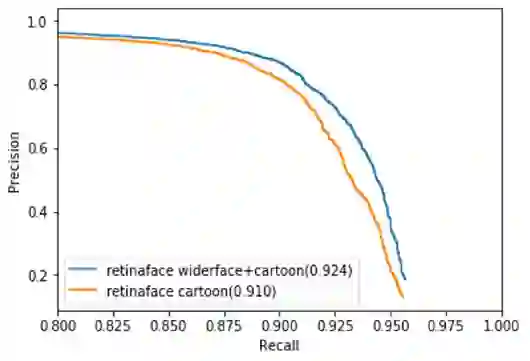 从表2可以发现,与F-ArcFace(即ArcFace+FL)相比,本文提出的方法的人脸识别性能将略有提高,图6同样验证了加入人脸识别的数据后卡通检测的性能也能得到提高。