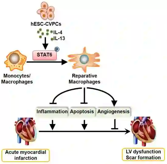 图:hESC-CVPCs对急性心肌梗死的修复作用。hESC-CVPCs通过旁分泌IL-4与IL-13,激活巨噬细胞STAT6并促进巨噬细胞向修复型极化,从而调节急性心梗后炎症反应,减少心梗后心肌细胞凋亡,增加血管新生,并改善了心脏功能。