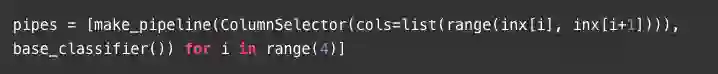 我们将使用功能强大的mlxtend扩展库,使stacking算法变得更加容易。对于四个基本分类器中的任何一个,我们都构建了一个可以选择适当特性的传递方法,并遵循LogisticRegression算法的途径。