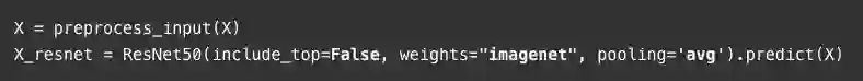首先,我们将用Resnet50模型(参见论文和keras文件)进行特征提取。注意,我们所使用的是大小为244X244像素的图像。为了生成整个数据集的向量representations,需要添加以下两行代码: