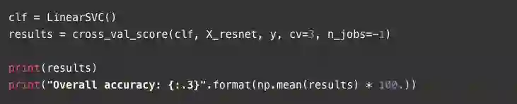 当模型被创建时,使用preprocess_input函数对初始训练数据(ImageNet)进行规范化,即求出平均信道像素值的减法结果。ResNet50.predict进行实际转换,返回代表每个图像大小为2048的向量。当首次被调用时,ResNet501d[1]的构造器会下载预训练的参数文件,所需时间长短取决于您的网速。之后,用这些特征向量和简单的线性SVM分类器来进行交叉验证过程。