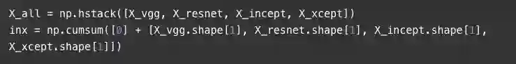 每个预训练的模型(如上述的ResNet)都可以生成特征集(X_vgg, X_resnet, X_incept, X_xcept),我们以此作为开始(完整的代码请参阅git repo)。方便起见,将所有的特征集合叠加到一个单独的矩阵中,但是保留边界索引,以便每个模型都可以指向正确的集合。