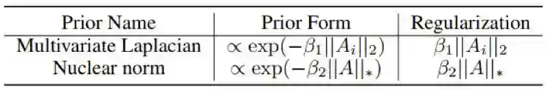 为了通过动态矩阵 A 的秩而从 MTS 数据集恢复固有的维度,我们应该选择能够诱导出预期的低秩性质的特定先验。我们有两种引导低秩动态矩阵的选择:(1) 多元拉普拉斯先验,(2) 核范数先验。如表 1 所示: