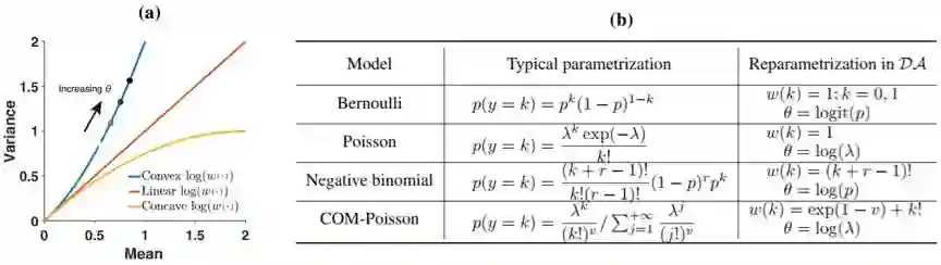 图 2:(a) 函数 w(·) 的不同选择的 DA 分布的均值和方差。当 log w(·) 固定时,增大θ会使均值和方差更大(更黑的点);(b) 通过参数化 θ 和 w(·) 而得到的 DA 分布的常见计数分布特例。