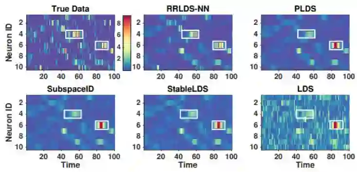 我们在模拟数据和真实世界数据的基准方法上对我们的框架进行了评估。出色的表现说明我们的方法:(1) 能够自动减少隐含状态空间的冗余维度,从而防止与大量预定义隐含状态过拟合;(2) 相比于基准方法,能显著提升预测有噪声神经尖峰活动的表现;(3) 能稳健且有效地检索来自两个实验数据集的基础复杂神经系统的固有维度。
