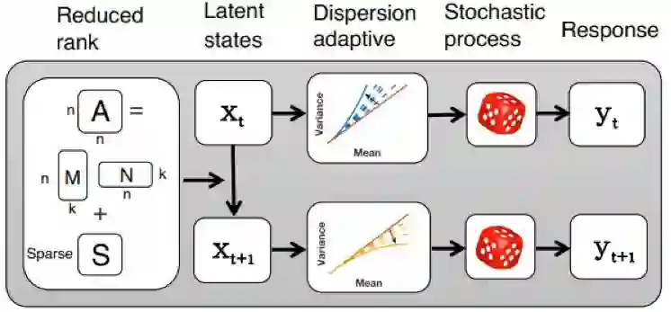 有了两种降秩结构和 DA 分布,现在我们可以将它们与一个隐含的线性动态系统耦合起来。我们将这个系统称为 RRLDS,该系统有利于建模有限的计数数据来检索固有维度。我们将其用于建模在大脑神经元上记录到的时间序列数据(尖峰计数),而且也可以简单直接地将其用于描述和解读其它计数过程的观察值。
