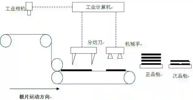 锂电池极片的生产过程中,会因为涂布机、辊压机的原因产生露箔、暗斑、斑、掉料等缺陷,制片后人工对极片进行检测。该检测系统可代替人工对极片进行检测,挑选出次品极片,实现极片检测的自动化。
