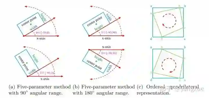 首先介绍了三种常见的任意旋转框的定义方法,包括两种角度范围的五参数定义法以及八参数的四边形定义法,如下图所示: