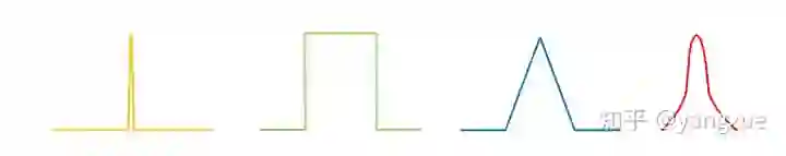我们列举了四种满足上述上述条件的窗口函数,分别是脉冲函数、矩形函数、三角函数、高斯函数,如下图所示: