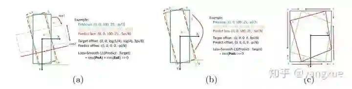 (a) -regression-based:最理想的角度回归路线是由蓝色框逆时针旋转到红色框,但由于角度的周期性,导致按照这个回归方式的损失非常大(参见上图右边的Example)。此时模型必须以更复杂的形式回归(例如蓝色框顺时针旋转,同时缩放w和h),增加了回归的难度。通过下图(a)右边的example,我们可以发现损失值的突增来源于两部分,一个是角度周期性(periodicity of angular,PoA),另一个是边的交换性(exchangeability of edges,EoE)。