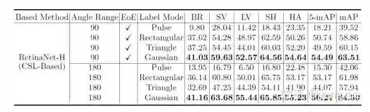 上面的工作无法像CSL这样分的这么细(比如,他们是将人脸以10度一个类,变成36分类问题),况且CSL还要考虑相邻类别之间的角度距离,预测容忍度,以及角度的周期性问题。虽然这个工作的效果还是挺不错的,但是还是存在一些问题,比如角度类别太多,会导致RetinaNet的head部分过于厚,所以我认为,CSL+anchor free可能是一个不错的研究方向,可以明显减小image-level预测方式的负担。